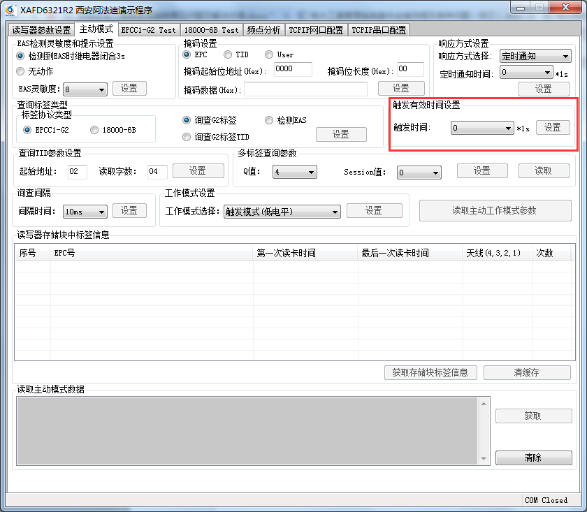 解決方法:(1)系統中基礎設置中設置門禁機地址為指紋機IP地址,確保指紋機的IP地址和電腦的IP地址在一個網段,指紋機和電腦配置中的兩個端口號一致;(2)連上讀寫器測試軟件將觸發有效時間設置為0,如下圖所示;